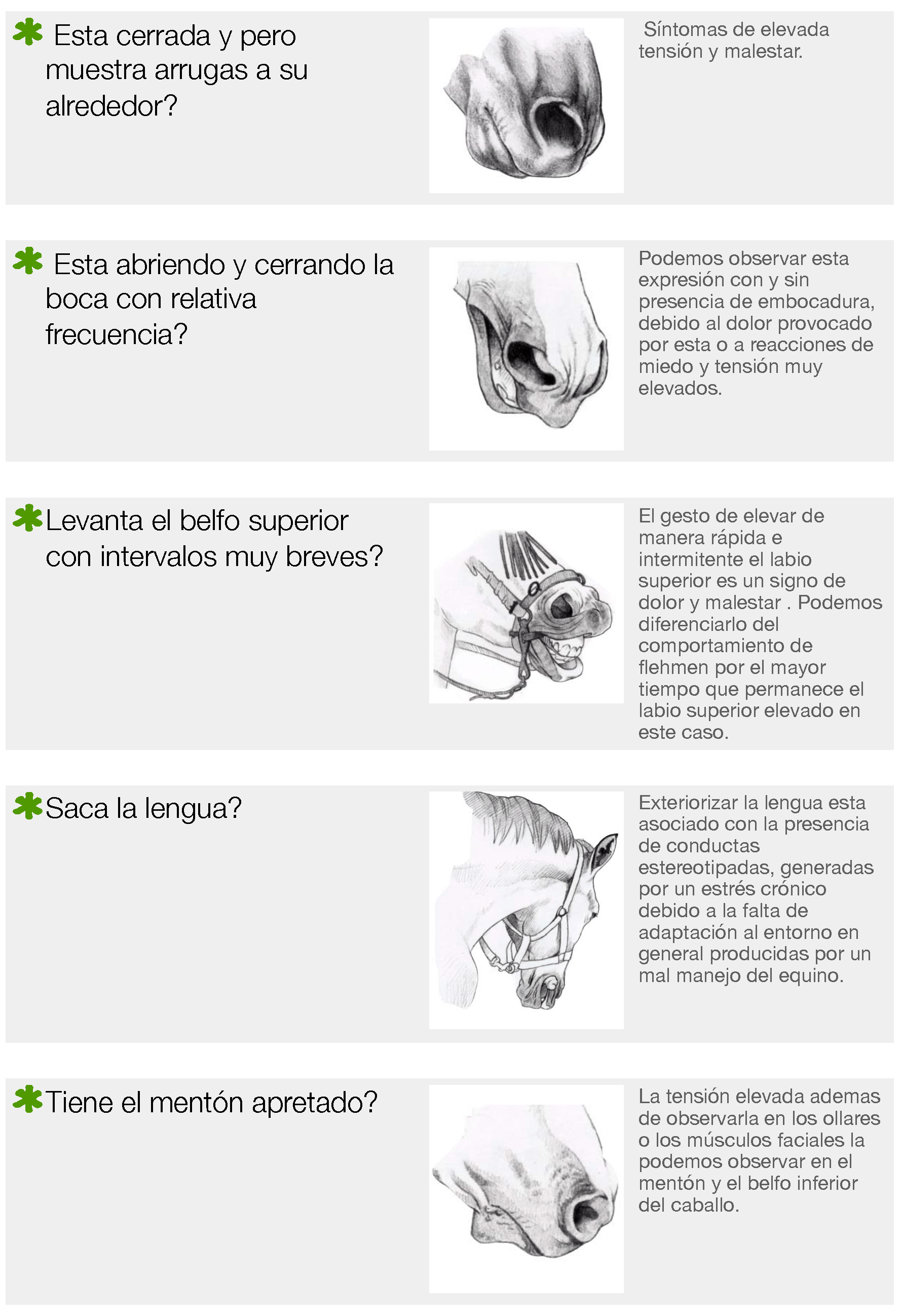 Sin embargo, es relativamente fácil a pesar de que no sepamos nada de caballos saber identificar algunos gestos o expresiones faciales que nos permitan saber cuándo pueden estar bien, mal o muy mal.